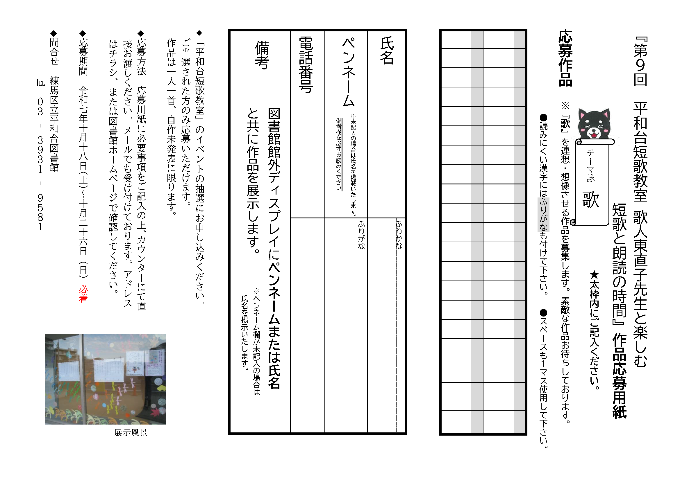 ※平和台図書館カウンターにて配布しております。また作品応募用紙(png 276 KB)はダウンロードも可能です。